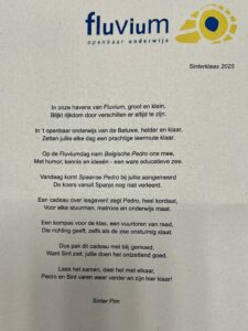 Met deze banketstaven komt ook een boek mee voor het team. Dat is de nieuwste uitgave van Pedro de Bruyckere (spreker op onze Fluviumdag). Cadeautjes uit Spanje van ‘SinterPim’ als grote waardering voor het belangrijke werk wat jullie iedere dag doen. Veel leesplezier en succes in deze drukke decembertijd!